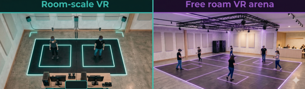 Before buying hardware, operators should decide how much space they can dedicate, what kind of group they want to attract, and whether the attraction needs to run as walk-up traffic or bookable sessions. That decision usually determines whether room-scale, free-roam, or seated VR is the right model.