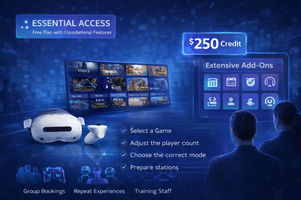 Essential Access provides access to the SynthesisVR platform without a monthly commitment, allowing venues to operate real sessions while evaluating workflows in their own environment. The included $250 software credit can be applied toward additional features as needed, making it possible to test operational tools before deciding how the system should be configured long term.