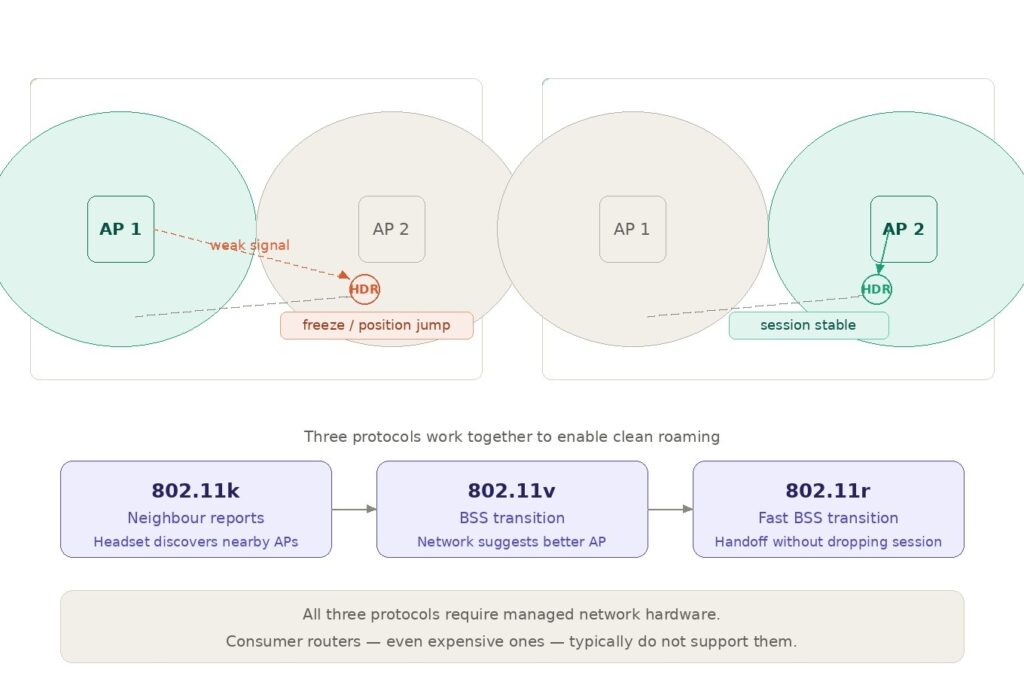 Three network protocols work together to solve this: 802.11k helps devices discover nearby access points, 802.11v enables the network to suggest better connections, and 802.11r enables fast handoff between access points without dropping the session. Managed network hardware supports all three. Consumer routers, even expensive ones, typically do not.