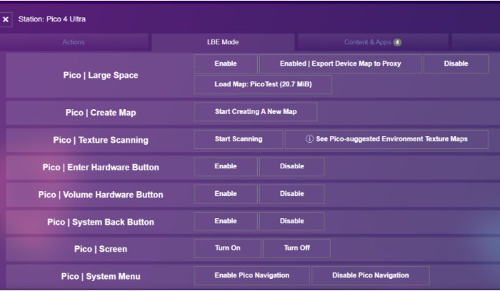 When a PICO Enterprise headset is registered under a SynthesisVR account, the platform detects the built-in LBE software automatically. The LBE tab appears in the headset settings without any manual activation. For operators coming from consumer headsets or earlier enterprise setups, this is where standalone VR management starts to look genuinely different.