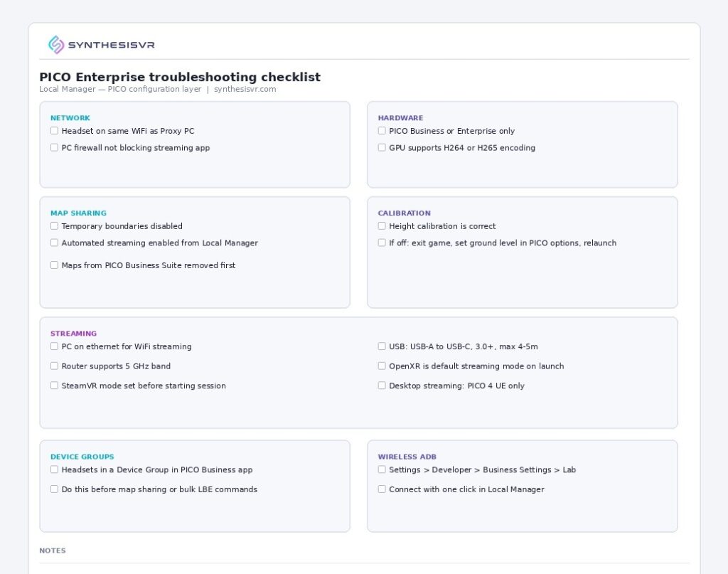 Confirm the headset is on the same WiFi network as the Proxy PC. LBE features are only available on PICO Business and Enterprise models;they will not appear on consumer headsets. Temporary boundaries must be disabled and automated streaming enabled for map sharing to function. Any map deployed directly via the PICO Business Suite outside of SynthesisVR needs to be removed before using the platform’s map management, it will overwrite the active boundary and can interrupt a live session. For streaming issues, confirm the PC firewall is not blocking the streaming application and that the GPU supports H264 or H265 encoding. If height calibration is off, exit the game, set the ground level correctly in PICO options, and relaunch.